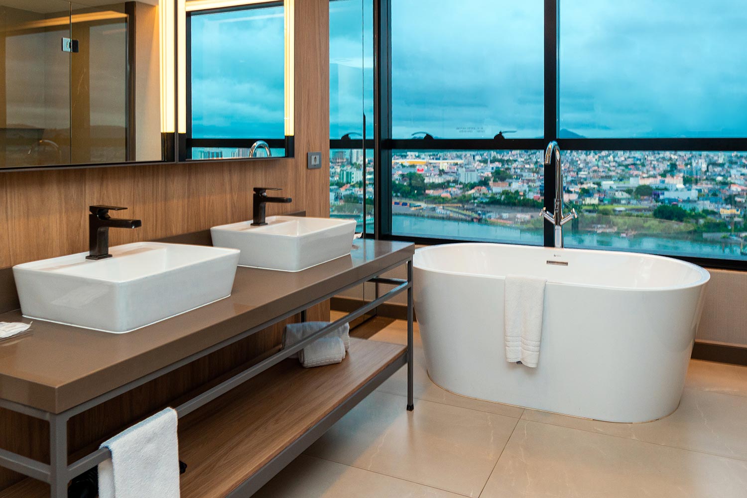 As suítes Master oferecem confortáveis camas de casal, antessala, mesa de trabalho com ar condicionado, TV a cabo e banheiro com banheira.